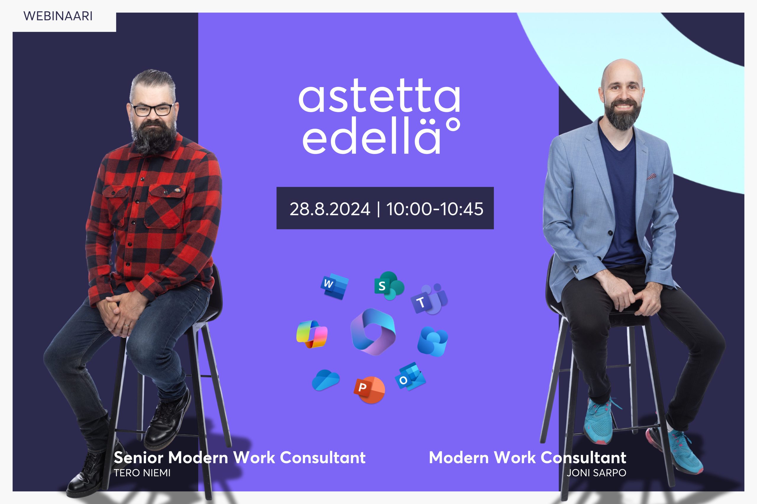 Astetta edellä on webinaarisarja kaikille modernin työn mestareiksi haluaville. Webinaarissa keskustellaan työn muutoksesta ja ruoditaan Microsoft 365 -maailman kuluneen kuukauden kuulumisia: uusia ominaisuuksia, poistuvia tuotteita ja muita muutoksia Teamsissä, Outlookissa, SharePointissa, OneDrivessa, Streamissä, M365 Copilotissa, Vivassa, jne.