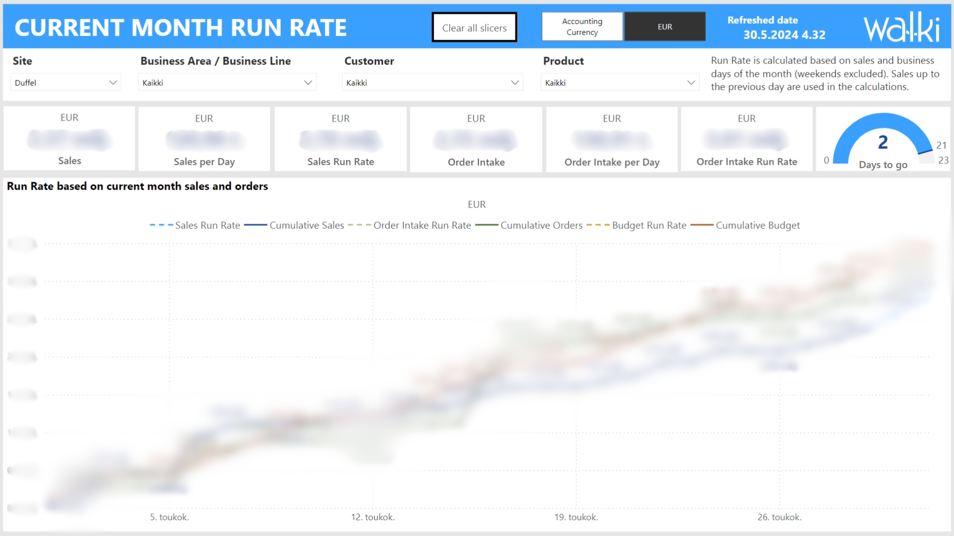 Walki Groupin raportointi oli hajautettu, paikoittain epäluotettava eikä siinä ollut läpinäkyvyyttä. Projektin myötä käytössä olevan Power BI -raportoinnin potentiaali hyödynnettiin, ja nyt Walkilla on käytössään selkeät raportit, joiden visuaalisten elementtien avulla tunnuslukujen ja trendien huomaaminen sekä analyysien tekeminen on helpompaa. Uusi raportointimalli on luotettava ja lisää työn tehokkuutta. Power BI -hallintomalli huolehtii tästä pitkällä aikavälillä.